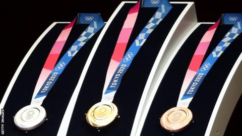 Pingat emas, perak dan gangsa berserta reben dan bekasnya bagi kedua-dua temasya sukan itu diperkenalkan pada majlis “1 Year to Go!” Sukan Olimpik Tokyo 2020 di Tokyo, Jepun hari ini.