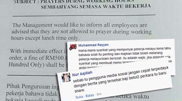 Memo bertarikh 30 Julai itu memaklumkan bahawa semua pekerja tidak dibenarkan pergi solat pada waktu bekerja kecuali pada waktu makan tengah hari sahaja.