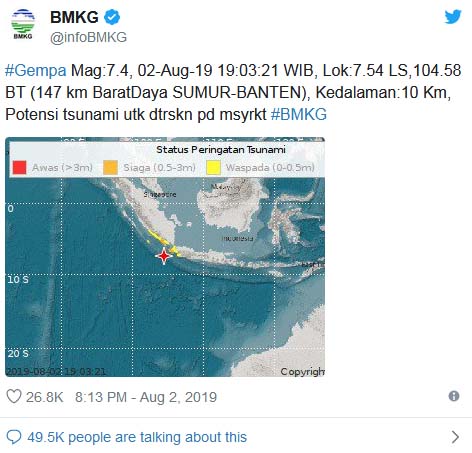 Jabatan Meteorologi, Kajian Iklim dan Geofizik (BMKG) Indonesia, mengeluarkan amaran tsunami.